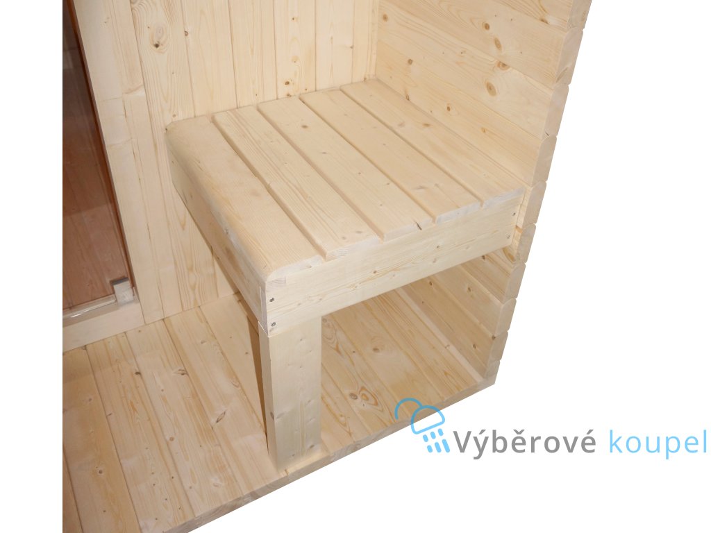 Interiér je vybaven dvěma širokými lavicemi po obou stranách (každá o rozměrech cca 154 × 48 cm), které poskytují komfortní sezení i ležení a vytvářejí ideální podmínky pro společné saunovací rituály, relaxaci i hlubokou regeneraci těla.