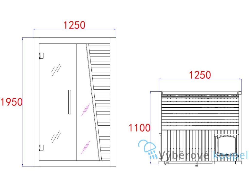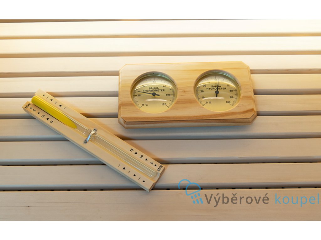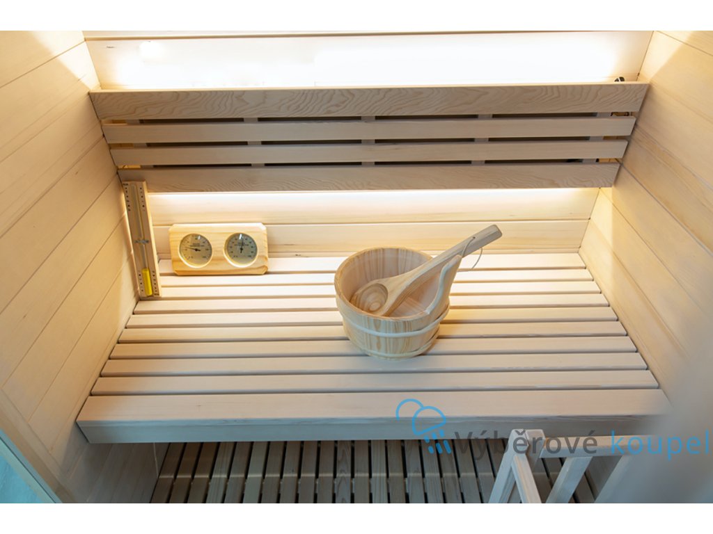 - výbava: saunové kamna, saunové kameny, saunové vědro, naběračka, přesýpací hodiny, teploměr